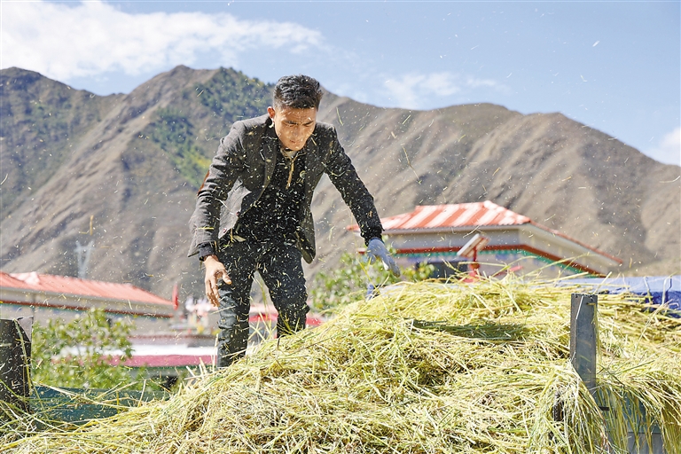 水稻豐收,村民喜笑顏開。記者 卓瑪七林 攝