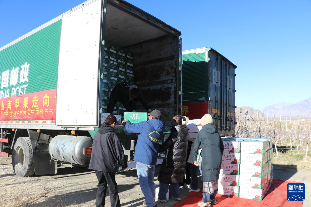 山南市扎囊縣矮化蘋果種植基地工作人員正在裝車。(山南市委宣傳部供圖)