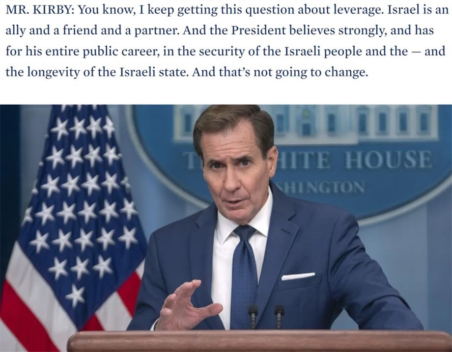 白宮國家安全委員會戰(zhàn)略溝通協(xié)調(diào)員柯比當天在記者會上被反復追問“美國是否會切斷對以色列的武器供應”時一味回避躲閃,但在回答美以關(guān)系問題時卻斬釘截鐵。