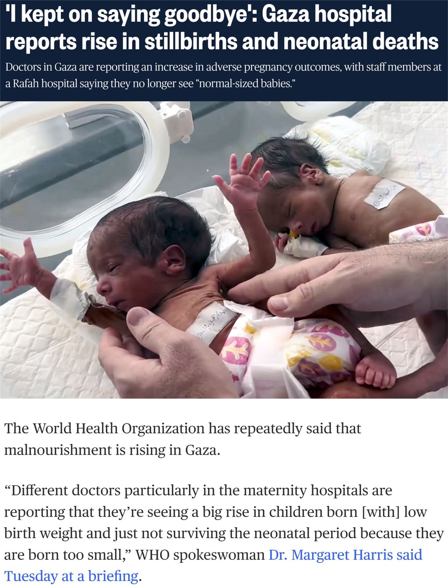 受此影響,加沙地帶大量兒童正處于營養(yǎng)不良或身體極度虛弱的狀態(tài),新生兒的情況更是不容樂觀。