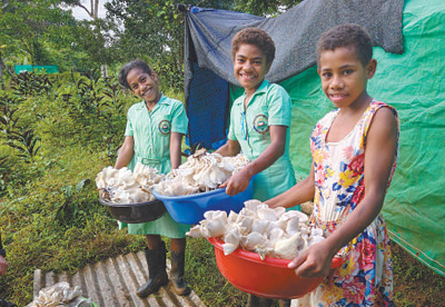 中國政府面向斐濟等太平洋島國推廣菌草技術(shù),推動當(dāng)?shù)亟?jīng)濟發(fā)展,助力當(dāng)?shù)孛裆纳?。圖為在斐濟奈塔希里乳業(yè)婦女組織菌草技術(shù)示范點,孩子們正在幫忙采菇。