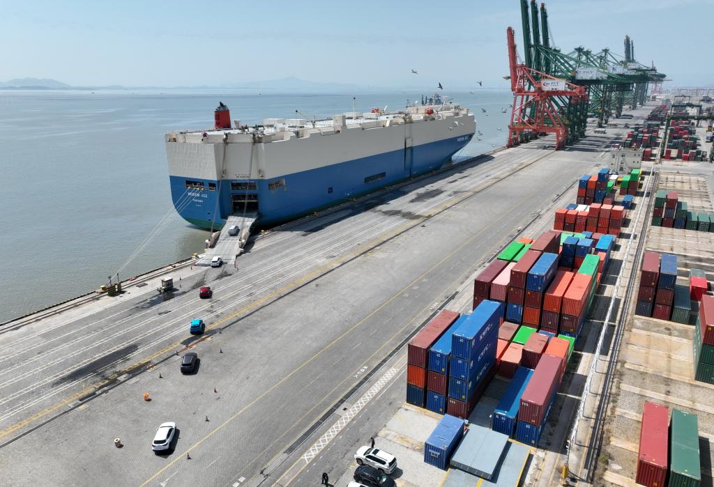 3月12日,準(zhǔn)備出口的車輛從福州港江陰港區(qū)碼頭駛上遠(yuǎn)洋滾裝輪(無(wú)人機(jī)照片)。新華社記者林善傳攝