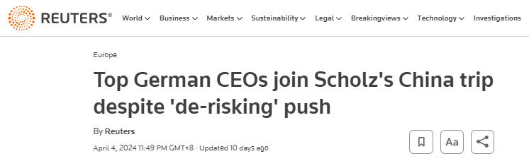 路透社分析稱(chēng),這份高管名單,凸顯了中國(guó)作為德國(guó)最大貿(mào)易伙伴的“重要份量”。