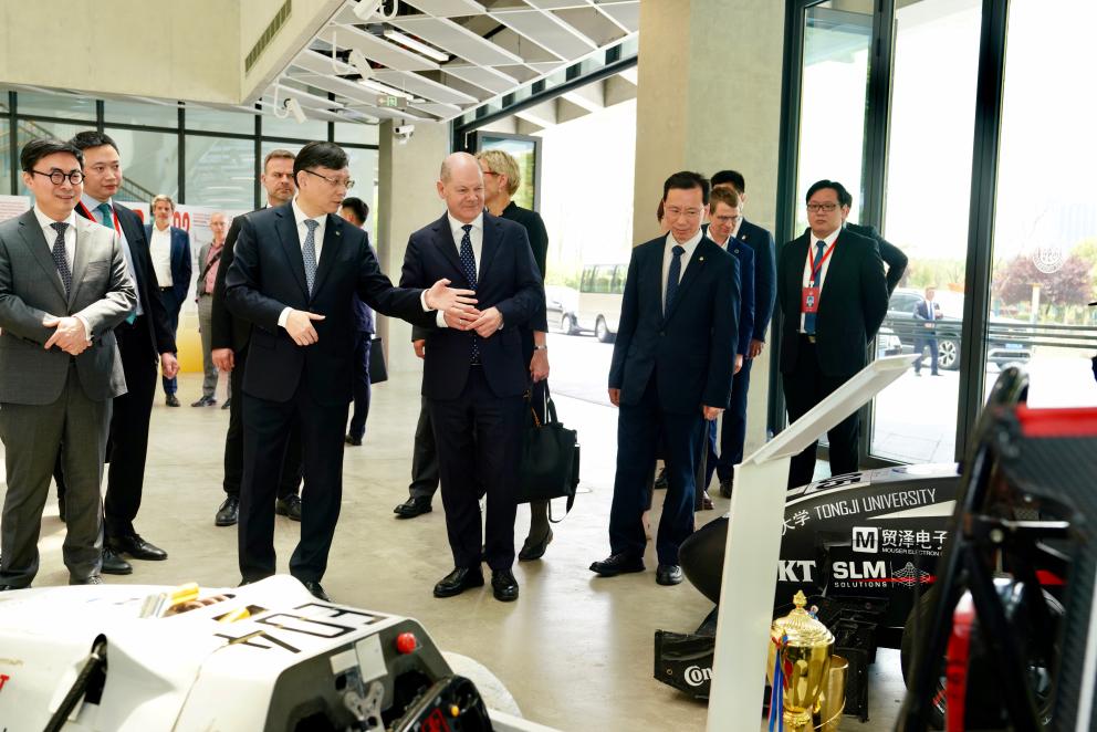 4月15日,德國總理朔爾茨(前排左三)在上海參觀同濟大學科研創(chuàng)新作品。新華社記者高峰 攝