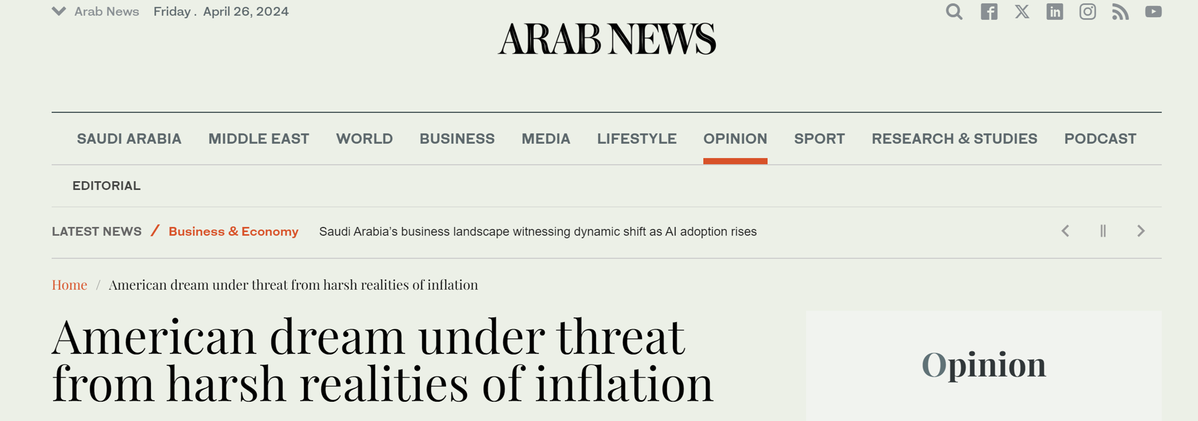 沙特阿拉伯媒體《阿拉伯新聞》網(wǎng)站4月24日刊發(fā)評論文章稱,美國通脹高企,物價不斷上漲,導(dǎo)致民眾的購買力持續(xù)下降,基本生活消費品成為無力負(fù)擔(dān)的“奢侈品”?!懊绹鴫簟北粴埧岬默F(xiàn)實擊潰。文章批評美國政府對通脹危機的反應(yīng)嚴(yán)重不足,將黨派問題置于解決民眾的迫切需求之上,削弱了民眾的信任感。