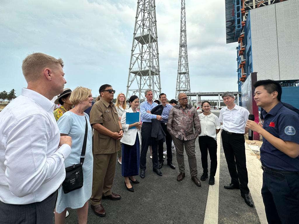 23日下午,使節(jié)團(tuán)走進(jìn)了正在建設(shè)中的海南國際商業(yè)航天發(fā)射中心現(xiàn)場(chǎng),站在已經(jīng)竣工的一號(hào)發(fā)射工位旁,使節(jié)們紛紛掏出手機(jī),從不同角度拍攝高聳入云的發(fā)射塔架。不等工作人員講解,不少使節(jié)圍上前問出心中的好奇。
