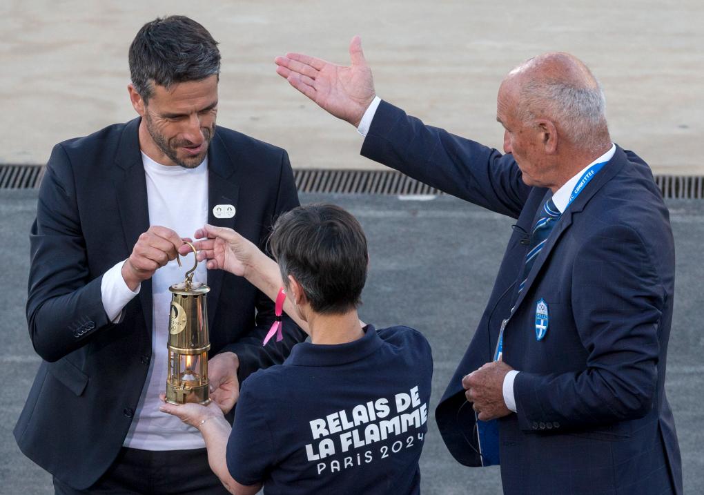 4月26日,巴黎奧組委主席埃斯坦蓋(左)將巴黎奧運(yùn)會火種燈交給工作人員。新華社發(fā)(馬里奧斯·羅洛斯攝)