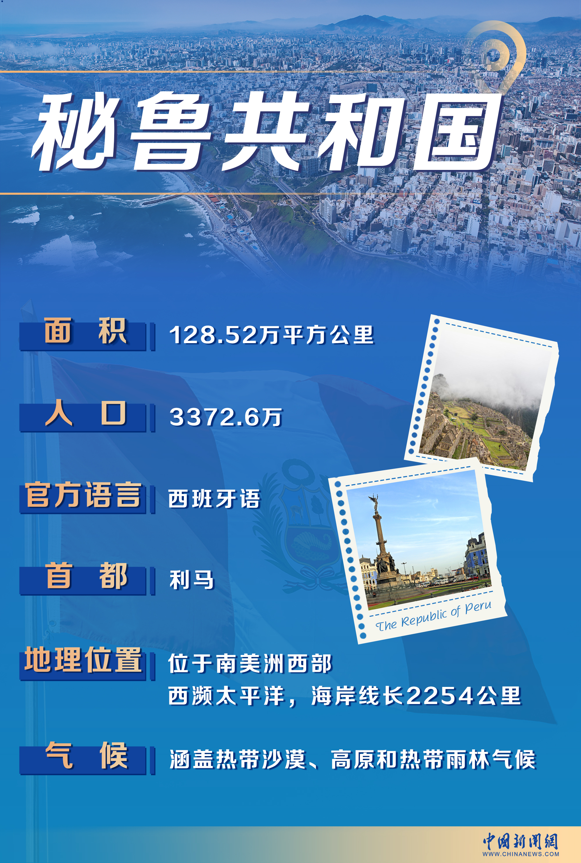 秘魯位于南美洲西部,西瀕太平洋,擁有2254公里的海岸線。首都是歷史悠久的利馬,全國人口達3372.6萬,官方語言為西班牙語。