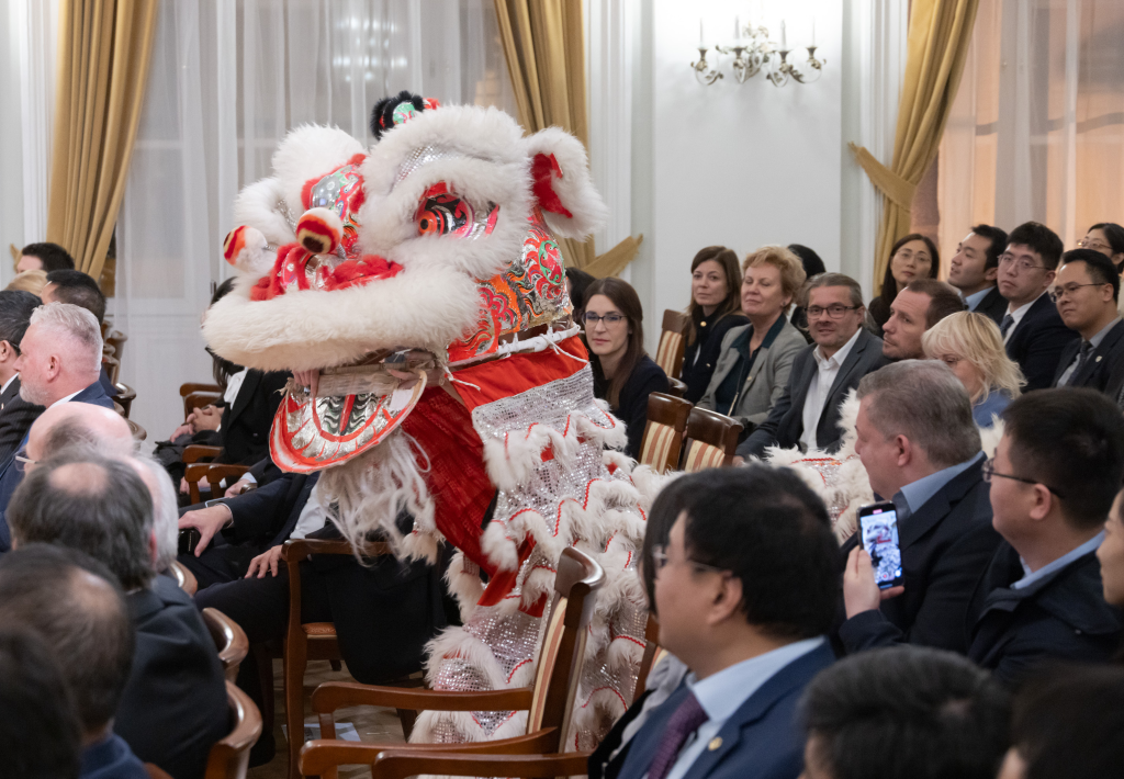 2023年11月20日,匈牙利羅蘭大學中文系成立100周年慶典在匈首都布達佩斯舉行,中匈各界百余名代表參加。圖為慶典上拍攝的舞獅表演。新華社發(fā)(弗爾季·奧蒂洛攝)