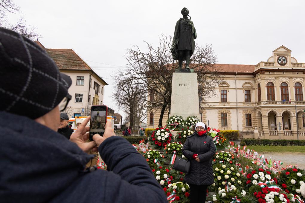 2023年3月15日,匈牙利首都布達佩斯和裴多菲出生地小克勒什舉行慶?;顒樱o念1848年革命和自由斗爭175周年。圖為民眾當日在小克勒什的裴多菲雕像前拍照留念。新華社發(fā)(弗爾季·奧蒂洛攝)