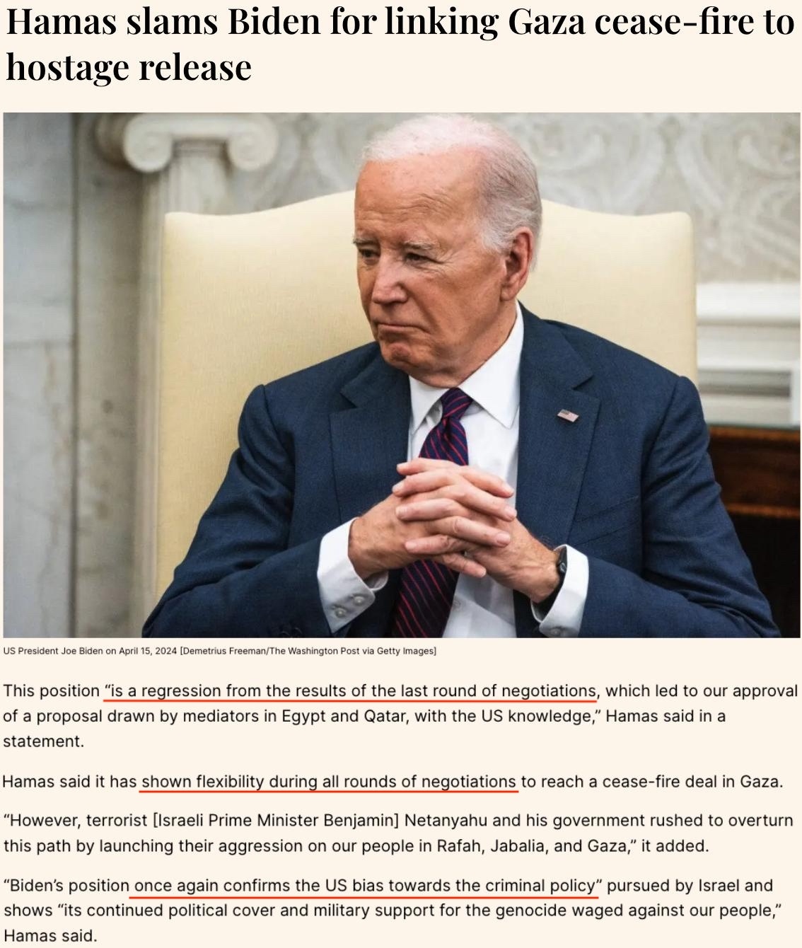 “拜登的言論令?;鹫勁羞M(jìn)程倒退,也再次證明了美國對(duì)以色列的偏袒”。