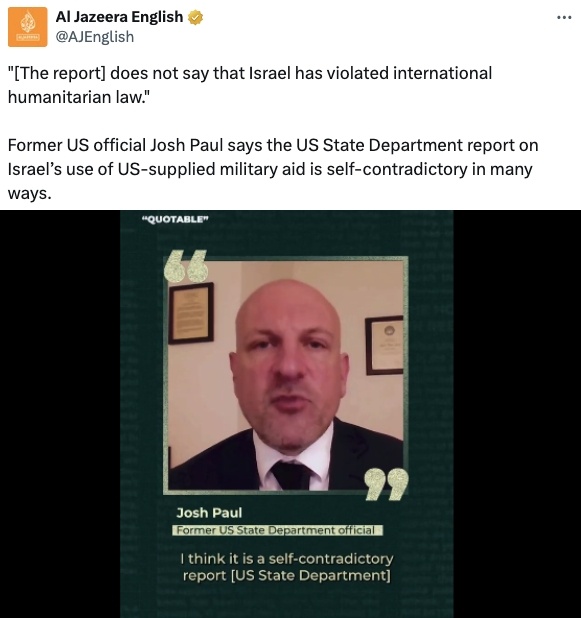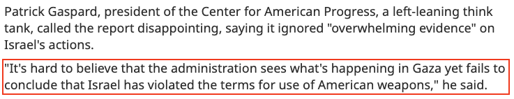 “報(bào)告中確實(shí)說,可以合理認(rèn)定以色列在違反國際人道主義法的行動(dòng)中使用了美制武器,但報(bào)告卻不明確說以色列違反了國際人道主義法?!?/p>