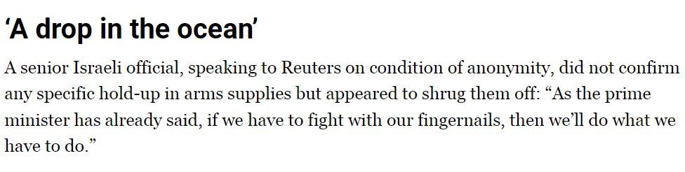 △卡塔爾半島電視臺(tái)網(wǎng)站:雖然內(nèi)塔尼亞胡政府嘴里說氣話,但其實(shí)心里不以為然,因?yàn)榕c美國提供給以色列的巨量武器相比,暫停運(yùn)送的武器只是“滄海一粟”。