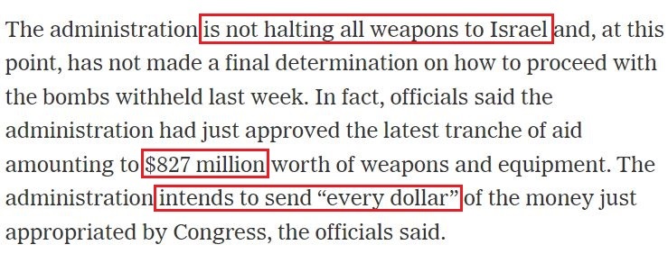 事實(shí)上,就在暫停向以色列運(yùn)送重型炸彈的同時(shí),拜登政府剛剛批準(zhǔn)了最新一批價(jià)值8.27億美元的對(duì)以軍事裝備援助。用美國官員們的話說,拜登政府打算把最新對(duì)以援助撥款的“每一美元”都用出去。