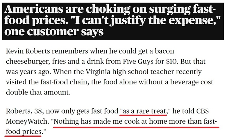 曾經(jīng)人人吃得起的快餐對(duì)普通美國(guó)人的意義不言而喻。但因?yàn)轭B固的通貨膨脹,這個(gè)意義現(xiàn)在已經(jīng)變了味。