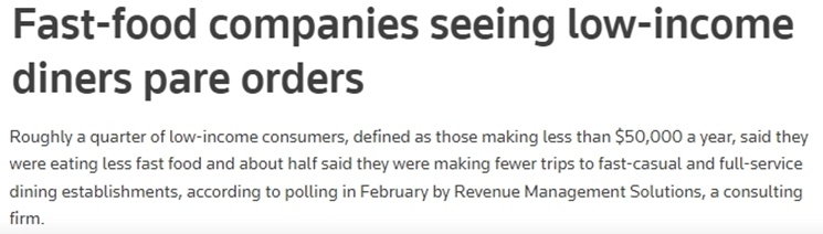 咨詢公司“收入管理解決方案”此前發(fā)布的一項(xiàng)民調(diào)結(jié)果顯示,年收入在5萬(wàn)美元以下的美國(guó)人中,約有四分之一的人減少了快餐消費(fèi)。