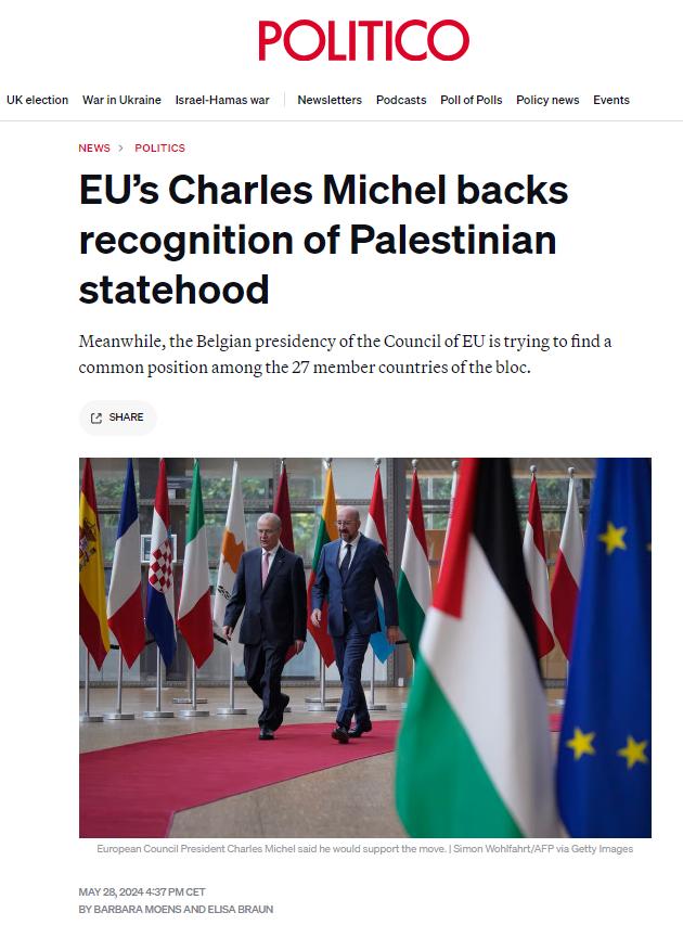 據(jù)《政客網(wǎng)》歐洲版28日?qǐng)?bào)道,盡管歐洲各國(guó)政府在何時(shí)或是否承認(rèn)巴勒斯坦國(guó)問題上仍然存在分歧,但歐洲理事會(huì)主席查爾斯·米歇爾表示他將支持這一舉措。