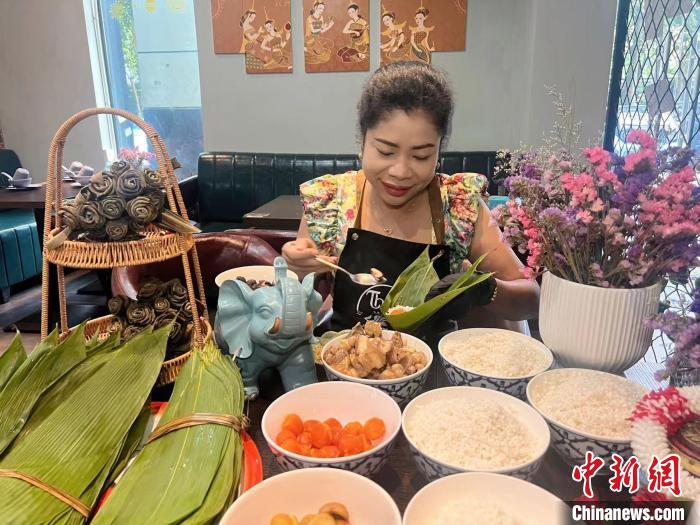 正值端午節(jié),歐春菊位于廣西南寧的泰式私房菜館賓客盈門,她制作的泰國(guó)風(fēng)味粽子、冬陰功湯、菠蘿炒飯、青木瓜沙拉等美食,為當(dāng)?shù)孛癖姷亩宋绮妥涝鎏砹水愑蝻L(fēng)味。