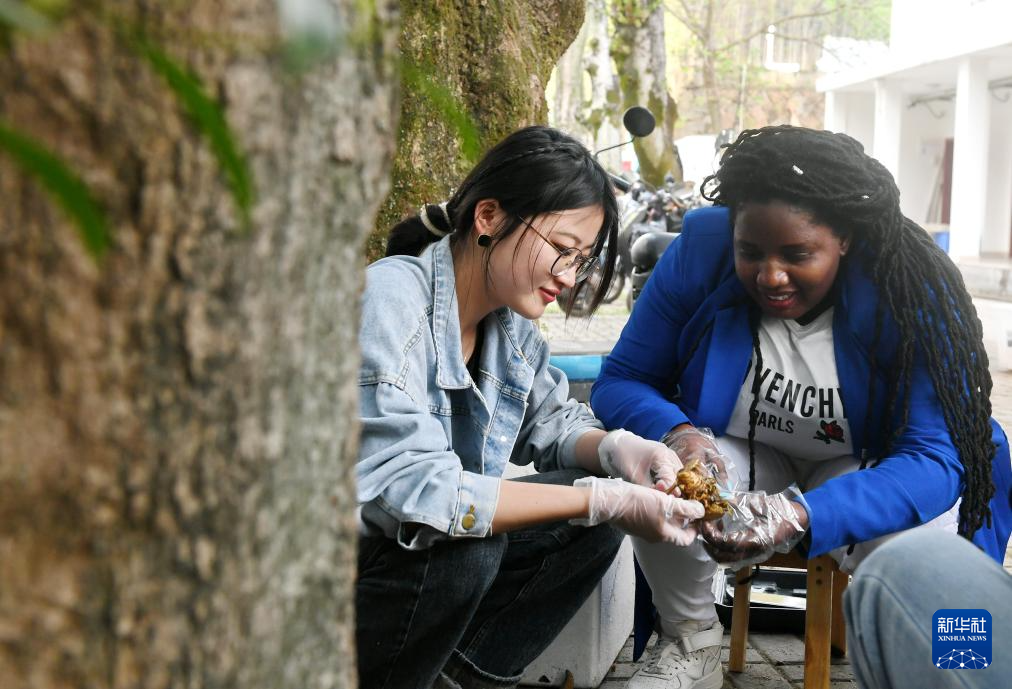2024年3月28日,在位于福州的福建農(nóng)林大學(xué),來(lái)自盧旺達(dá)的梅迪在國(guó)家菌草工程技術(shù)研究中心向中國(guó)學(xué)生嘉欣瑤了解“綠洲3號(hào)”菌草品種。新華社記者 林善傳 攝