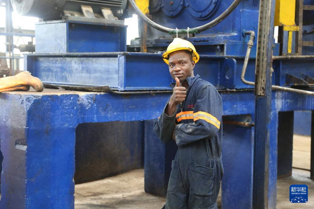 2024年6月10日,在科特迪瓦南部城鎮(zhèn)達(dá)布郊區(qū),美蘭橡膠加工廠(chǎng)工人在機(jī)器旁豎起大拇指。新華社記者 張健 攝