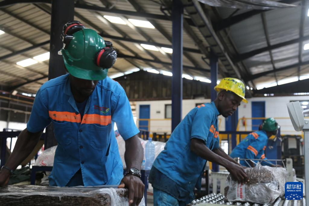 2024年6月10日,在科特迪瓦南部城鎮(zhèn)達(dá)布郊區(qū),工人們?cè)诿捞m橡膠加工廠(chǎng)對(duì)成品橡膠進(jìn)行打包。新華社記者 張健 攝