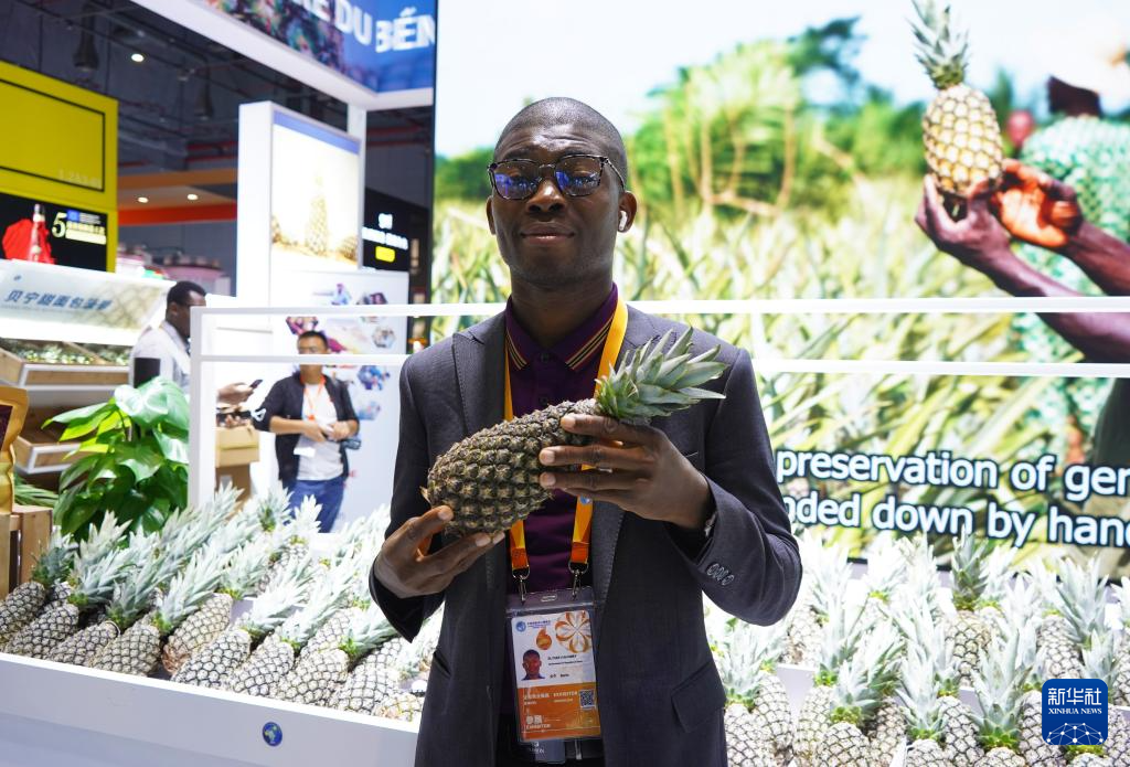 2023年11月8日,在第六屆進(jìn)博會(huì)食品及農(nóng)產(chǎn)品展區(qū)貝寧菠蘿展臺(tái),工作人員愛(ài)力舍展示貝寧菠蘿。這是貝寧菠蘿第一次參加進(jìn)博會(huì)。新華社記者 金皓原 攝
