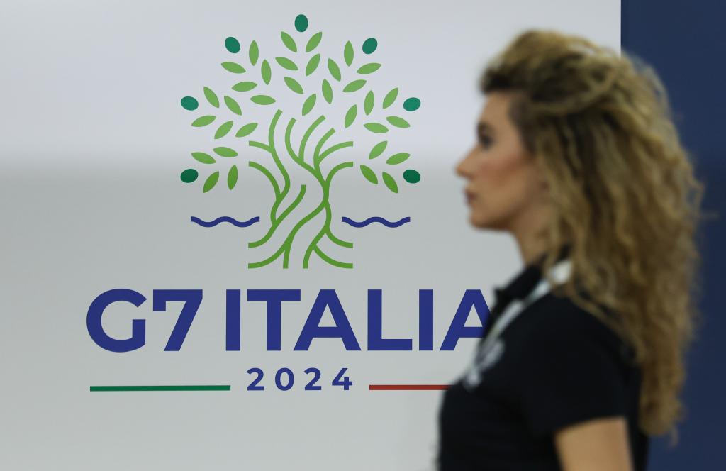 6月12日,在位于意大利普利亞大區(qū)巴里市的七國集團(tuán)峰會(huì)新聞中心,人們經(jīng)過展板。新華社記者李京攝