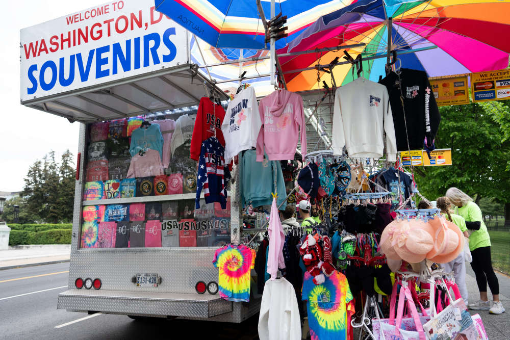 4月25日,在美國(guó)首都華盛頓,游客在一處白宮附近的紀(jì)念品攤位前選購(gòu)商品。新華社記者劉杰攝