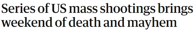 中國日?qǐng)?bào)網(wǎng)6月24日電 美國是世界上民間槍支保有量最多的國家,涉槍暴力已成為美國社會(huì)生活的“常態(tài)”。據(jù)英國《衛(wèi)報(bào)》23日?qǐng)?bào)道,在剛剛過去的周末,美國多地發(fā)生槍擊事件。
