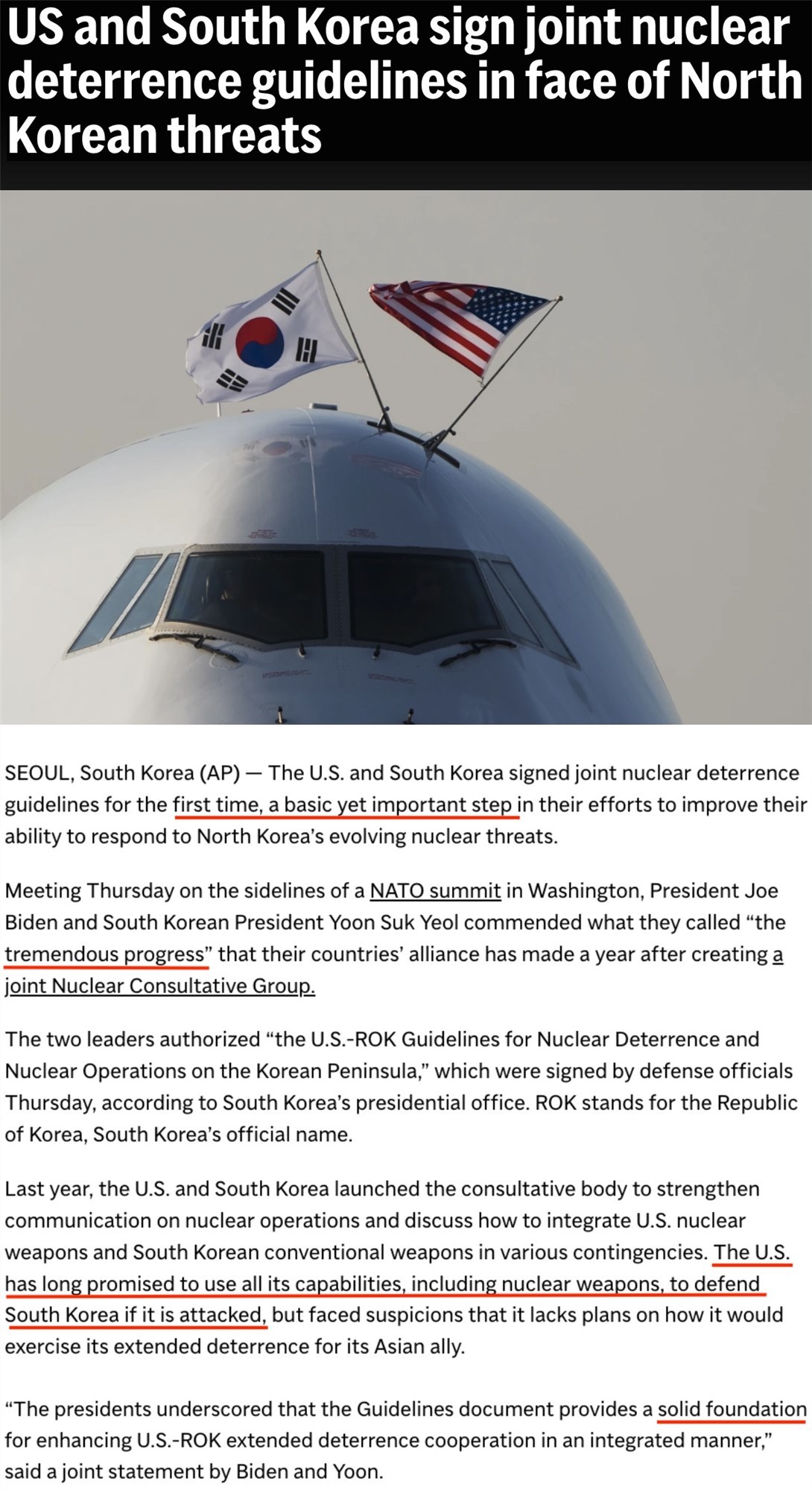 本月11日,在北約華盛頓峰會(huì)間隙,美韓兩國國防部官員簽署《美韓關(guān)于朝鮮半島核威懾與核作戰(zhàn)的指導(dǎo)方針》。這也是兩國首次簽署此類文件,被認(rèn)為是“兩國努力提高應(yīng)對朝鮮核威脅能力的基本且重要的一步”。