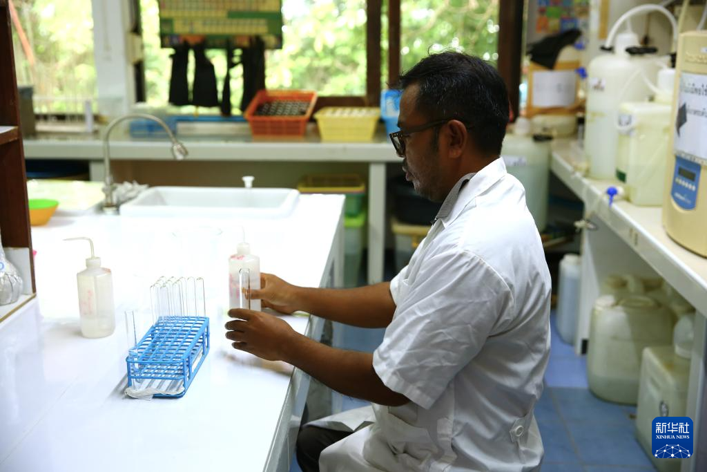 7月23日,在位于泰國普吉的中泰氣候與海洋生態(tài)系統(tǒng)聯(lián)合實(shí)驗(yàn)室,工作人員進(jìn)行水質(zhì)檢測。新華社記者 孫瑋彤 攝