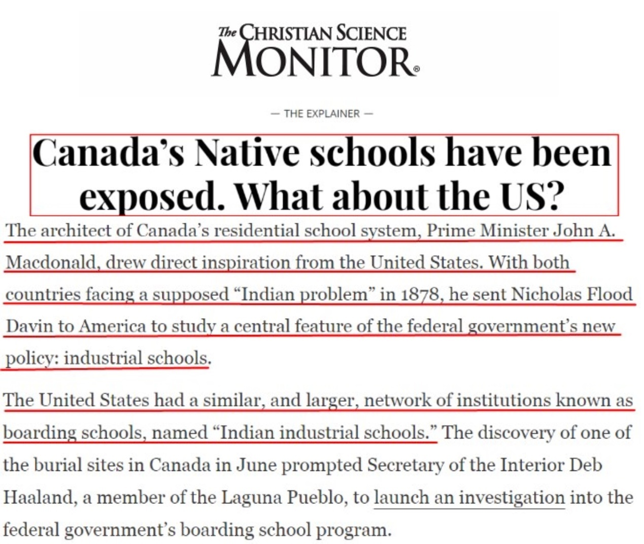 美國《基督教科學(xué)箴言報(bào)》曾發(fā)文揭露,加拿大原住民寄宿學(xué)校系統(tǒng)的所謂“靈感”本就來自美國。從1819年的所謂“印第安人文明開化法案”開始,美國便實(shí)施了一系列旨在“同化印第安人”的法律政策,在全國范圍設(shè)立或資助寄宿學(xué)校,強(qiáng)行安排印第安兒童入學(xué)。
