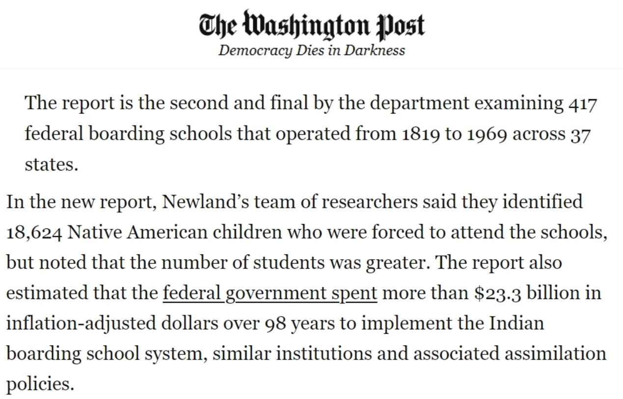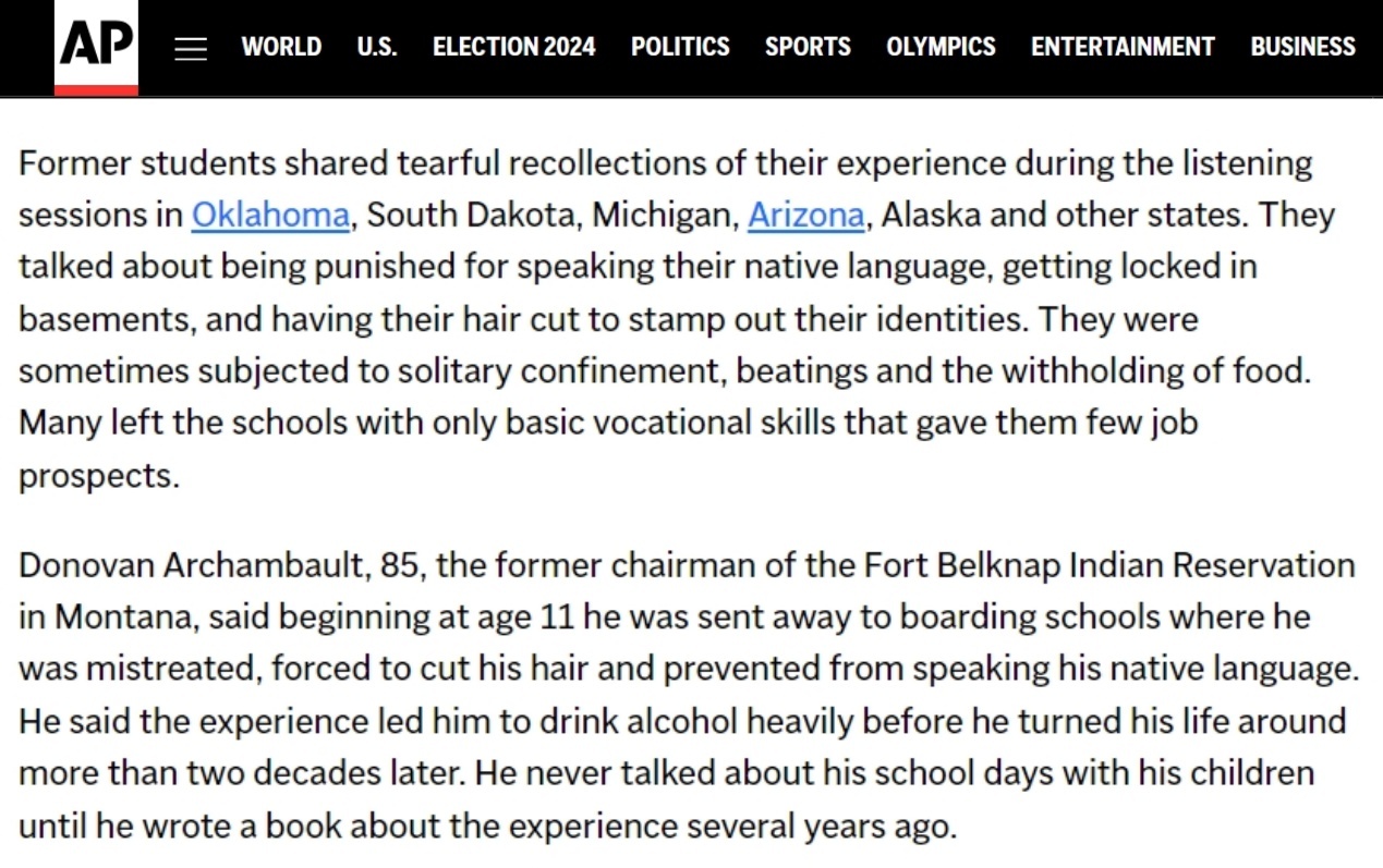 根據(jù)7月30日發(fā)布的調(diào)查報(bào)告,美國政府在這項(xiàng)綜合同化項(xiàng)目上花費(fèi)了相當(dāng)于今天的250億美元,其中包括在37個(gè)州和地區(qū)運(yùn)營417所寄宿學(xué)校,這些學(xué)校的兒童受到身體和性虐待。他們還被迫改信基督教,并因說母語而受到懲罰。
