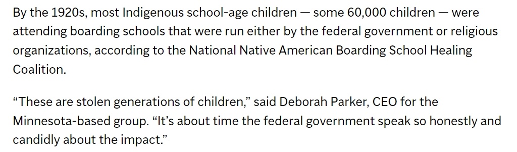 美國首位原住民出身的內(nèi)政部長德布·哈蘭也說,她自己的祖父母在8歲時(shí)被“從父母、文化和社區(qū)中偷走”,被迫住在一所天主教寄宿學(xué)校,直到13歲。還有一些被偷到寄宿學(xué)校的孩子年僅4歲。