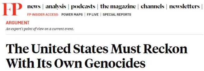 美國《外交政策》雜志曾發(fā)文說,雖然讓美國認(rèn)真對待自己的歷史是一項(xiàng)充滿政治風(fēng)險(xiǎn)的任務(wù),但即使美國自己拒絕“照鏡子”,其罪行也早已被其他人看得清清楚楚。文章敦促美國正視對原住民犯下的種族滅絕罪行,撕開所謂“完美美國”的假象。