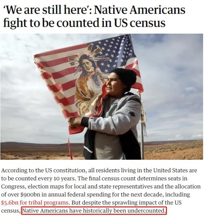 美國每十年統(tǒng)計(jì)一次居民人數(shù),最終人口普查結(jié)果決定了國會、州和地方的議席分配以及相應(yīng)的聯(lián)邦財(cái)政支出分配。但在這一過程中,美國原住民一直被忽視。
