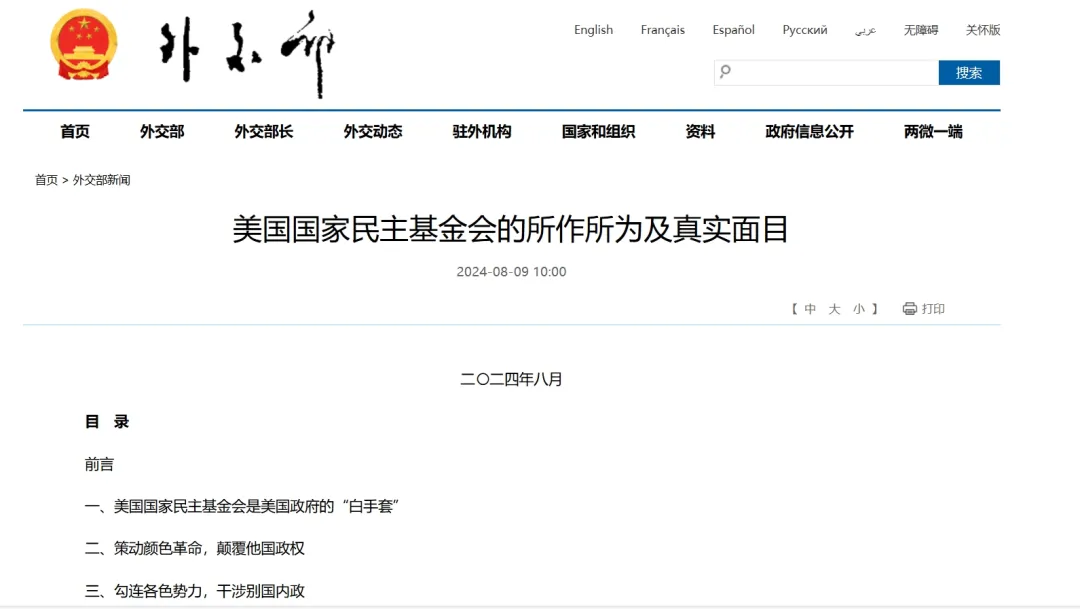 8月9日,中國外交部網(wǎng)站發(fā)布一份重磅報告:《美國國家民主基金會的所作所為及真實面目》。