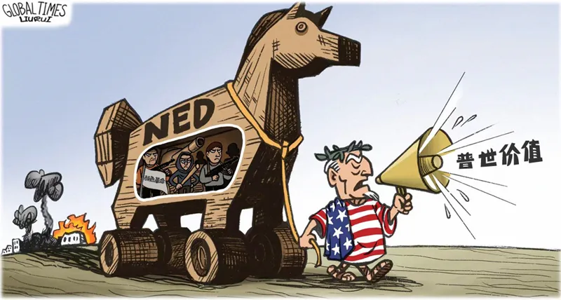 長期以來,美國將所謂普世價值工具化、武器化,煽動分裂對抗,干涉別國內(nèi)政,造成災(zāi)難性后果。NED就是美國政府禍亂別國的“特洛伊木馬”。圖源:《環(huán)球時報》
