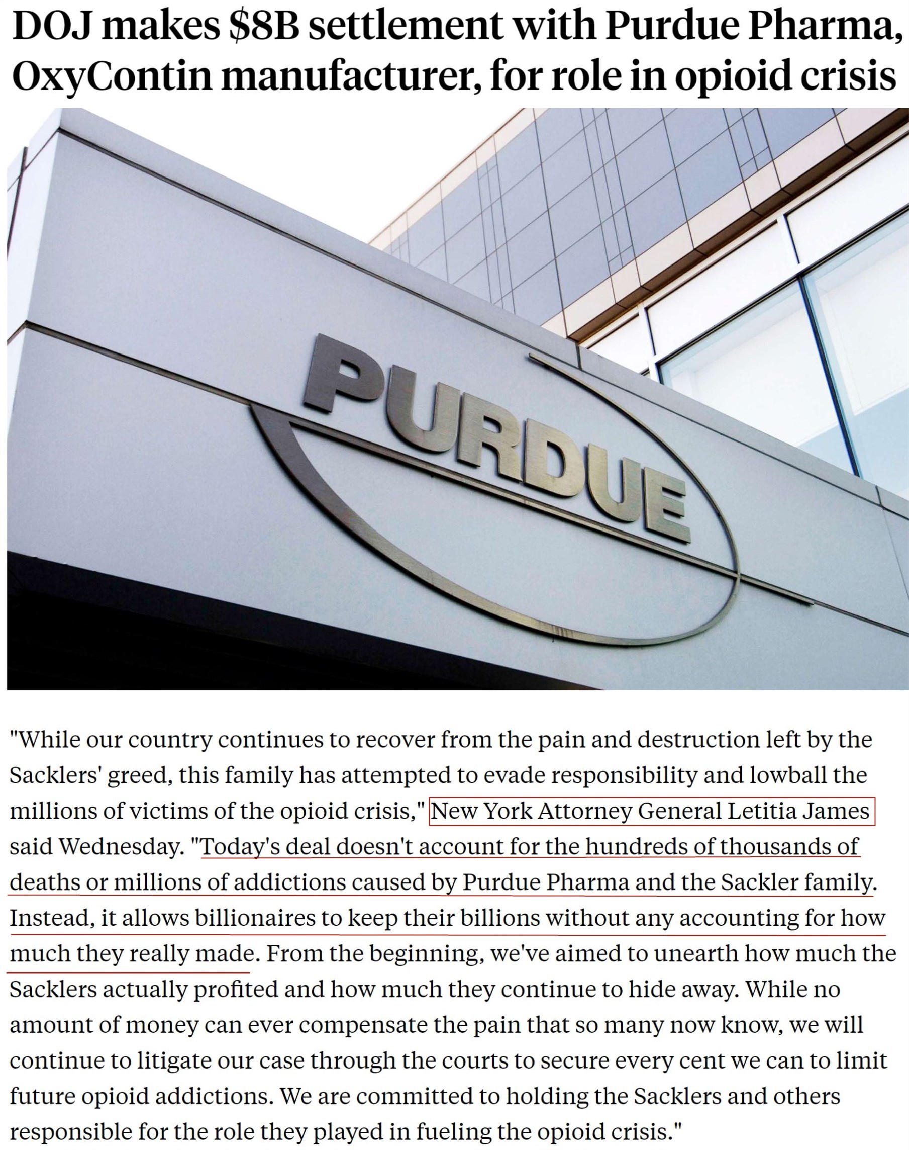 普渡制藥公司最終與美國(guó)司法部達(dá)成83億美元和解協(xié)議,對(duì)其阿片類止痛藥奧施康定遭到的三項(xiàng)重罪指控表示認(rèn)罪。和解協(xié)議還要求普渡制藥公司解體并轉(zhuǎn)型為一家新的提供成癮和過量治療藥物的公司。另外,普渡制藥公司的所有者薩克勒家族同意支付2.25億美元的民事責(zé)任賠償金。