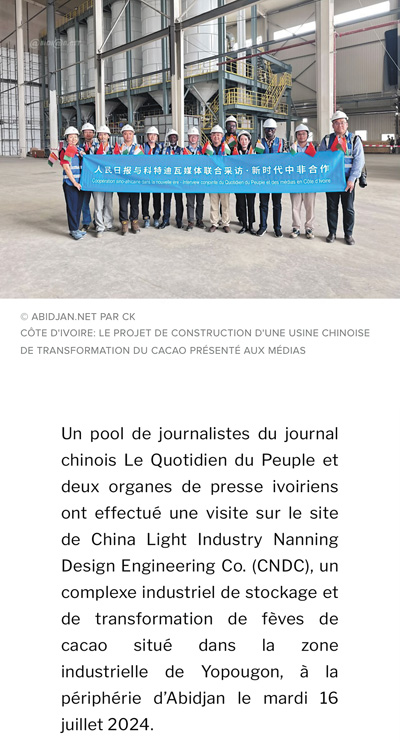 7月16日,人民日?qǐng)?bào)與兩家科特迪瓦新聞機(jī)構(gòu)記者一行參觀了由中國(guó)輕工業(yè)南寧設(shè)計(jì)工程有限公司總承包的可可加工及可可豆倉庫建設(shè)項(xiàng)目,該項(xiàng)目坐落在阿比讓郊區(qū)的約普貢工業(yè)區(qū)。