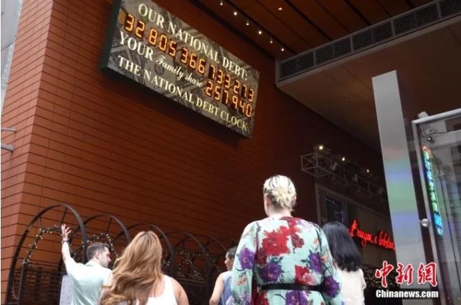 圖為2023年8月15日,紐約曼哈頓,美國“國債鐘”顯示屏前的背影。中新社記者 王帆 攝