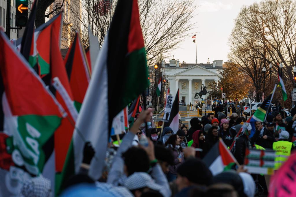 1月13日,在美國(guó)首都華盛頓,人們參加聲援巴勒斯坦的集會(huì)游行活動(dòng)。大批示威者揮舞旗幟和標(biāo)語(yǔ),高喊口號(hào)聲援巴勒斯坦,呼吁?;稹P氯A社發(fā)(亞倫攝)