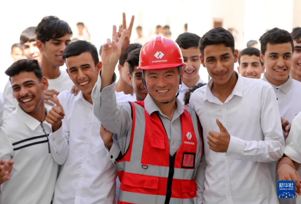 10月8日,在伊拉克穆薩納省一所中企承建示范學(xué)校,當(dāng)?shù)貙W(xué)生與前來回訪的中國工程師合影。新華社發(fā)(哈利勒·達(dá)伍德攝)
