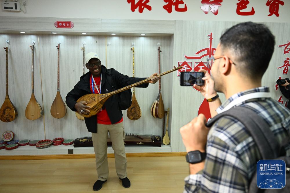 10月15日,與會嘉賓在阿克蘇地區(qū)新和縣加依村加依手工樂器產(chǎn)業(yè)園體驗(yàn)傳統(tǒng)樂器。 新華社記者 劉夢琪 攝