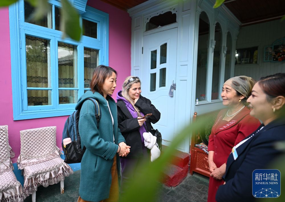 10月15日,與會嘉賓在吐魯番市高昌區(qū)亞爾鎮(zhèn)新城片區(qū)新城西門村參訪時(shí)與當(dāng)?shù)鼐用窠涣鳌?新華社記者 李明 攝