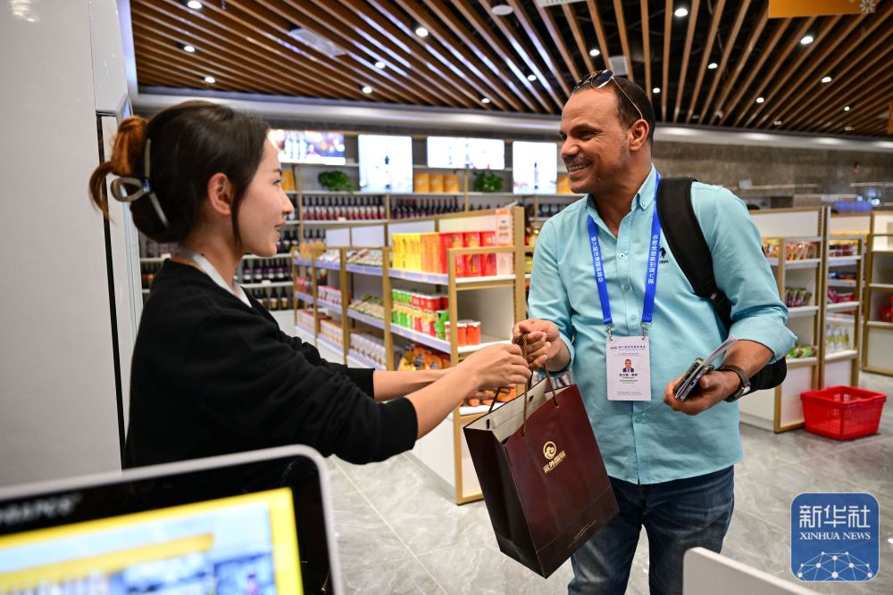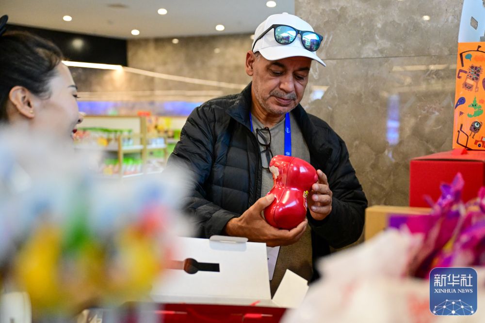 10月15日,與會嘉賓在新疆喀什跨境電商進(jìn)出口商品展示交易中心購買紀(jì)念品。 新華社記者 丁磊 攝