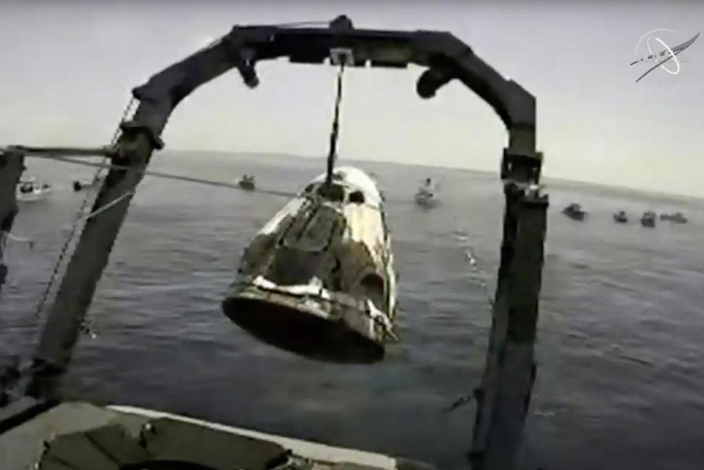 這張美國(guó)航天局2020年8月2日發(fā)布的視頻截圖顯示,回收船在美國(guó)東南部佛羅里達(dá)州附近的墨西哥灣打撈太空探索技術(shù)公司“龍”飛船。新華社發(fā)(美國(guó)航天局供圖)