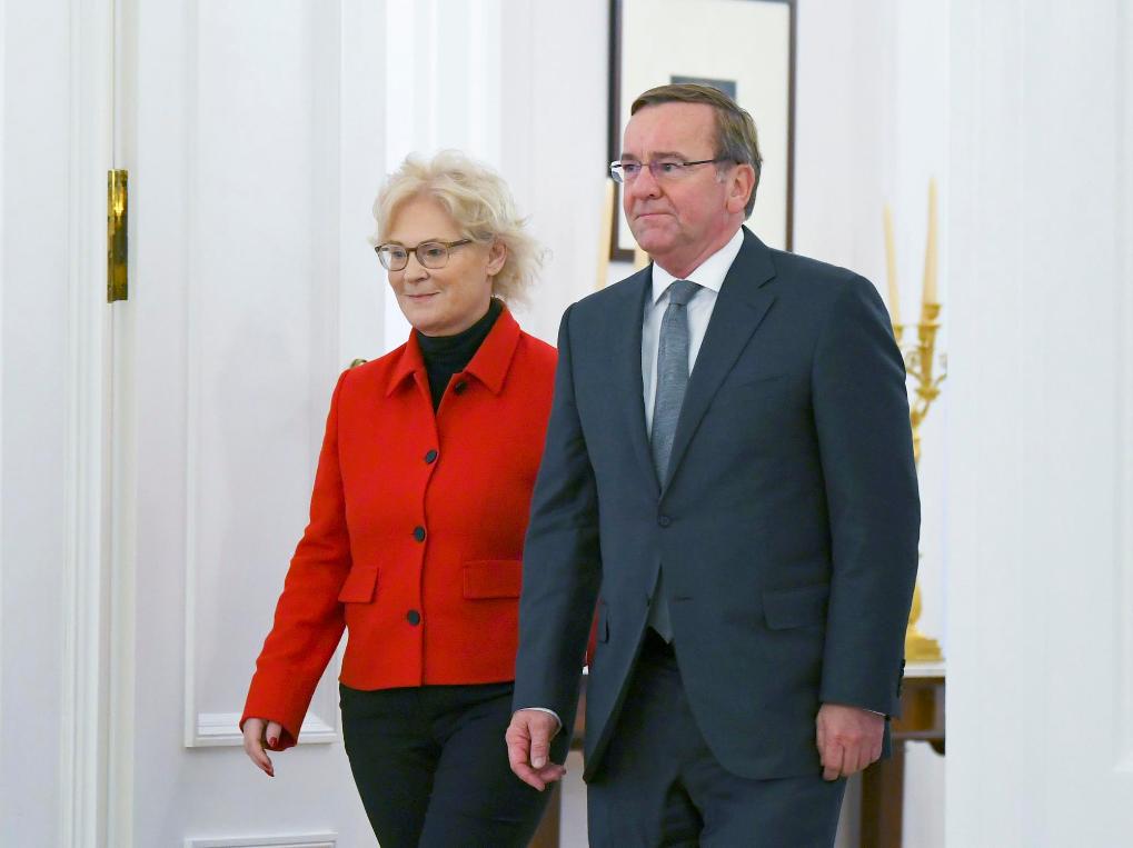 2023年1月19日,在德國柏林的總統(tǒng)府,皮斯托里烏斯(右)步入儀式現(xiàn)場。德國總統(tǒng)施泰因邁爾當日向鮑里斯·皮斯托里烏斯頒發(fā)任命書,正式任命其為國防部長。新華社記者任鵬飛攝