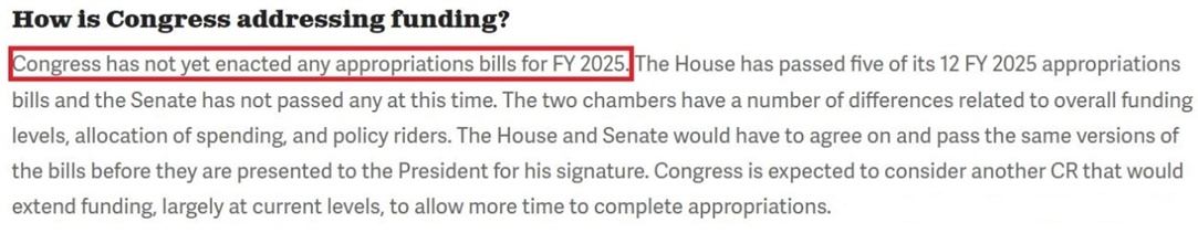 和以往一樣,白宮今年3月提出的2025財(cái)年預(yù)算案包含需要由國會(huì)中不同撥款委員會(huì)審批、分別為政府各機(jī)構(gòu)提供資金的12項(xiàng)撥款計(jì)劃,但這些年度撥款計(jì)劃迄今無一被國會(huì)通過。