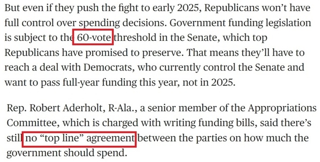 2024財(cái)年預(yù)算案就曾在驚險(xiǎn)異常的兩黨爭斗甚至共和黨內(nèi)斗中像擠牙膏一樣折騰了整整一年時(shí)間才消?!,F(xiàn)在又輪到了早從10月就開始的2025財(cái)年的預(yù)算問題。